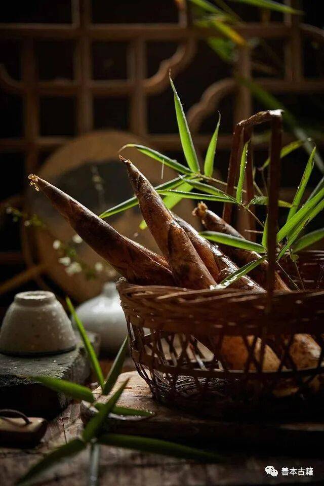 “傍林鲜”即煨竹笋。在春末夏初,林中的竹笋长得正好,人们就在竹笋旁边扫起竹叶点火,煨熟竹笋,因此叫“傍林鲜”。文同做临川太守时,有一天中午正和家人吃煨笋,忽然收到苏东坡的书信,信中附了一首诗:“相见清贫馋太守,渭川千亩在胃中。”文同看到这里,笑得把米饭喷了一桌子。文同是北宋梓州梓潼郡人,擅长诗书画,深受北宋文学家司马光赞许,和苏轼是表兄弟,两人关系特好。据考证,原诗是苏轼的《和文与可洋川园池三十首.·筼筜》:“汉川修竹贱如蓬,斤斧何曾赦箨龙。料得清贫馋太守,渭滨千亩在胸中。”“相见清贫馋太守,渭川千亩在胃中”一句,可能是《山家清供》的作者林洪在引用时进行了修改,我们现在已不得而知。苏轼打诨取笑文同吃了很多竹笋,文同正好吃着煨竹笋,因此正当其时笑喷了,这是多么接地气的生活场景啊。