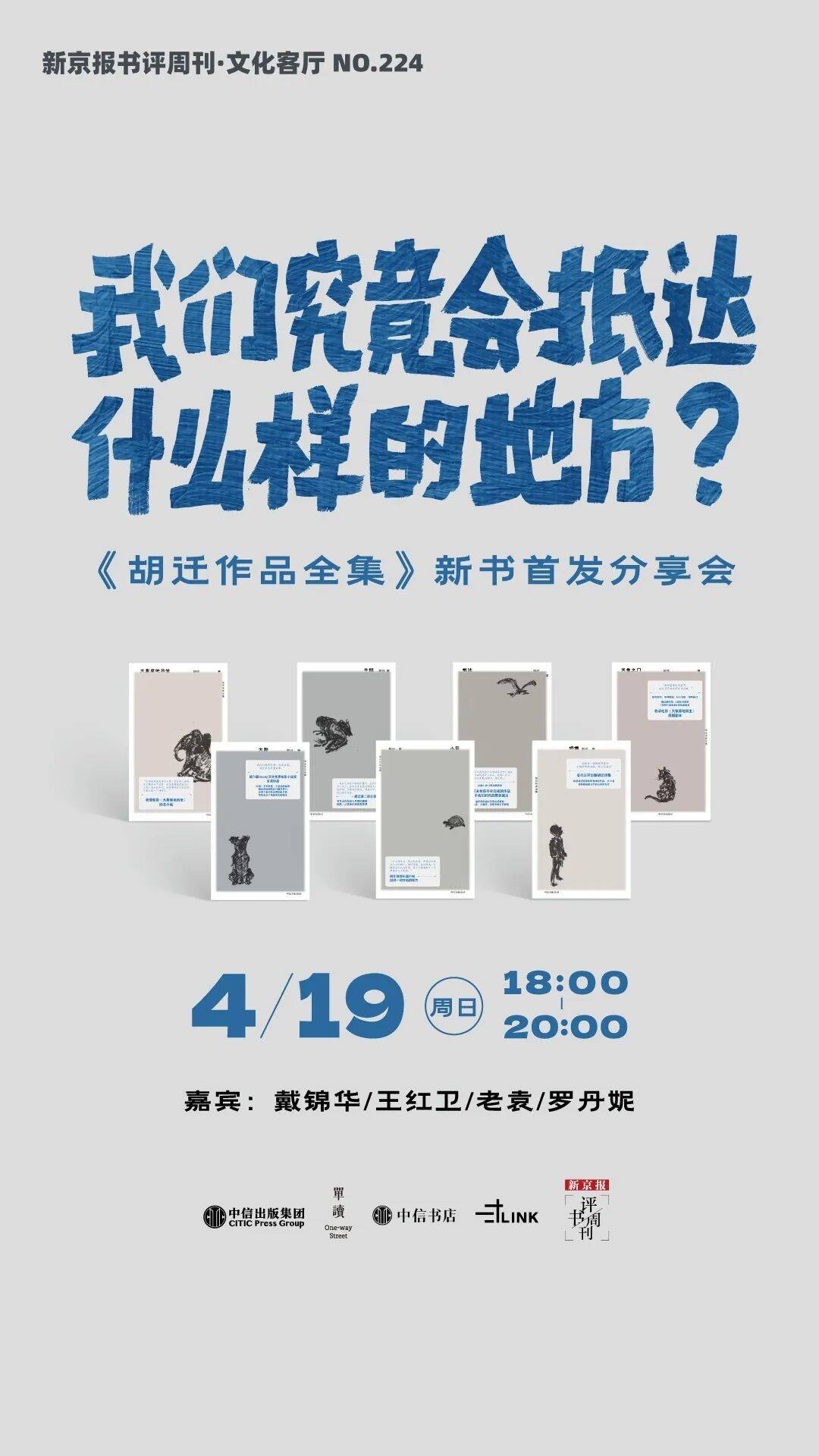 4 月 19 日(周日)18:00, 新京报书评周刊·文化客厅 NO.224,联动这本书的出版方 单读、 中信出版集团,以及 中信书店, 邀请北京大学人文特聘教授 戴锦华,著名监制 王红卫,播客《姐姐好读》主播之一,胡迁的同学 老袁,《胡迁作品全集》策划编辑 罗丹妮,来到 北京中信书店·启皓店,一同与读者分享出版 《胡迁作品全集》背后的故事、现实与精神的探索,也去思考——我们究竟会抵达什么样的地方。