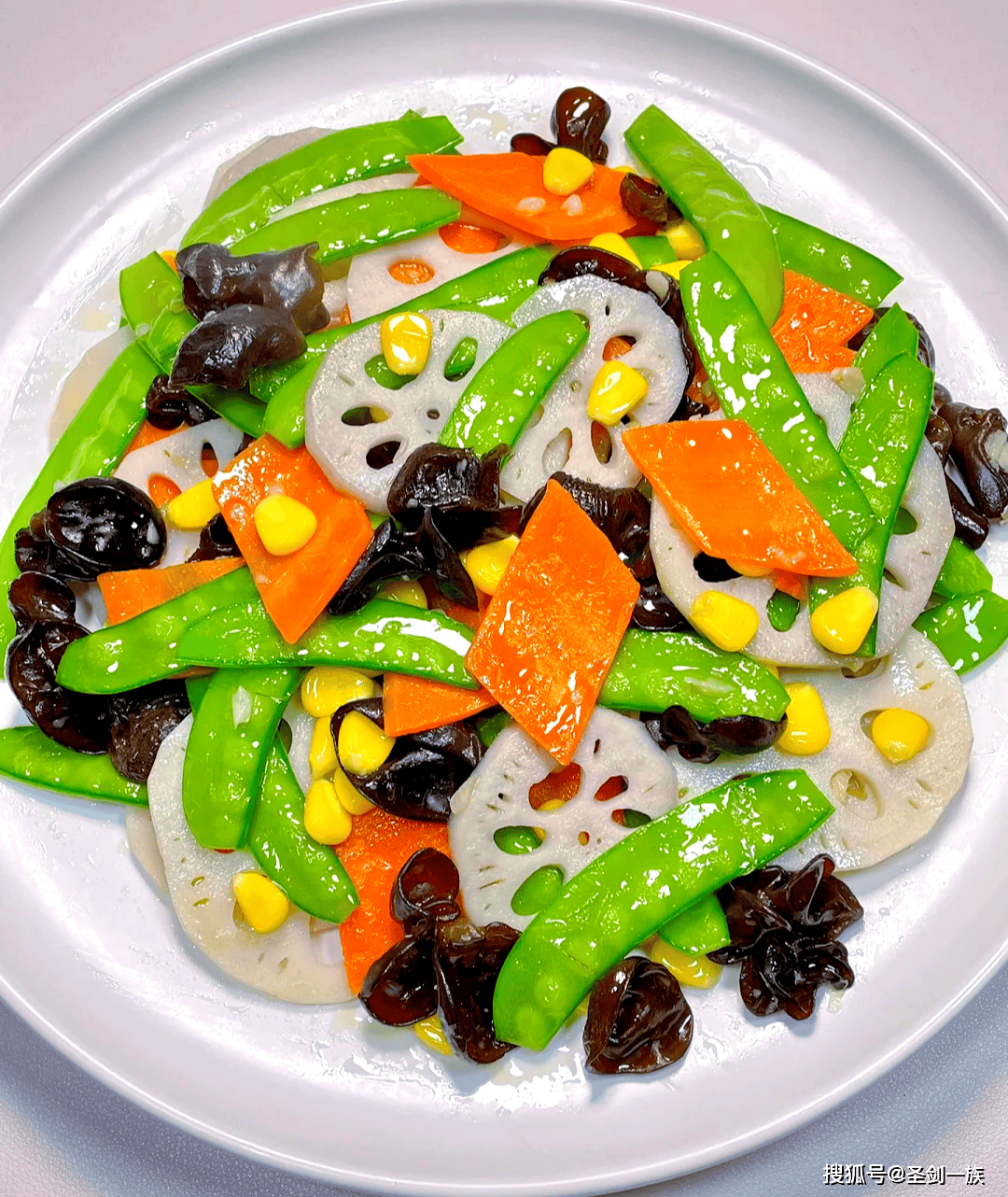 荷兰豆100g、莲藕1小节、山药1小节、木耳1小把、胡萝卜半根、百合1头、蒜2瓣、盐少许、白糖半勺、水淀粉1勺、食用油适量