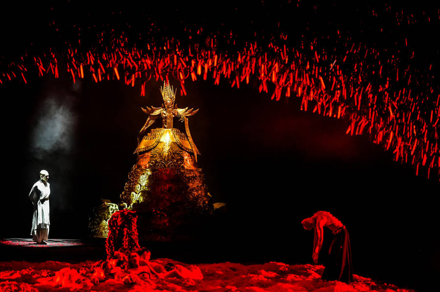 这些设计深深根植于中华传统文化:剪刀意象取自民间剪纸艺术的视觉基因;演员妆容溯源京剧程式;服装造型萃取中华经典美学元素;韩信的阴阳双身源于东方哲思;虞姬的反串延续戏曲传统。“我们并不是把传统文化搬上舞台就完事了。”杨丽萍说,“要取精华,不取全貌;要再造,不要复制。”正是这种“取意不取形”的方法,让《十面埋伏》既有浓厚的东方底色,又具有当代的先锋气质。