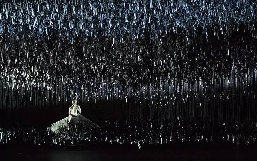 《十面埋伏》的舞台上,最令人过目不忘的视觉符号,莫过于凌空悬挂的万把剪刀。杨丽萍曾用“剪不断,理还乱”来形容这一装置——它既是东方式的隐喻,也是一种普世的心理压迫。剪刀随剧情变换阵势,时而如乌云压顶,时而如利剑悬垂,营造出无处不在的危机感,对应着每个人心中那柄“达摩克利斯之剑”:欲望、恐惧、算计,随时可能落下。