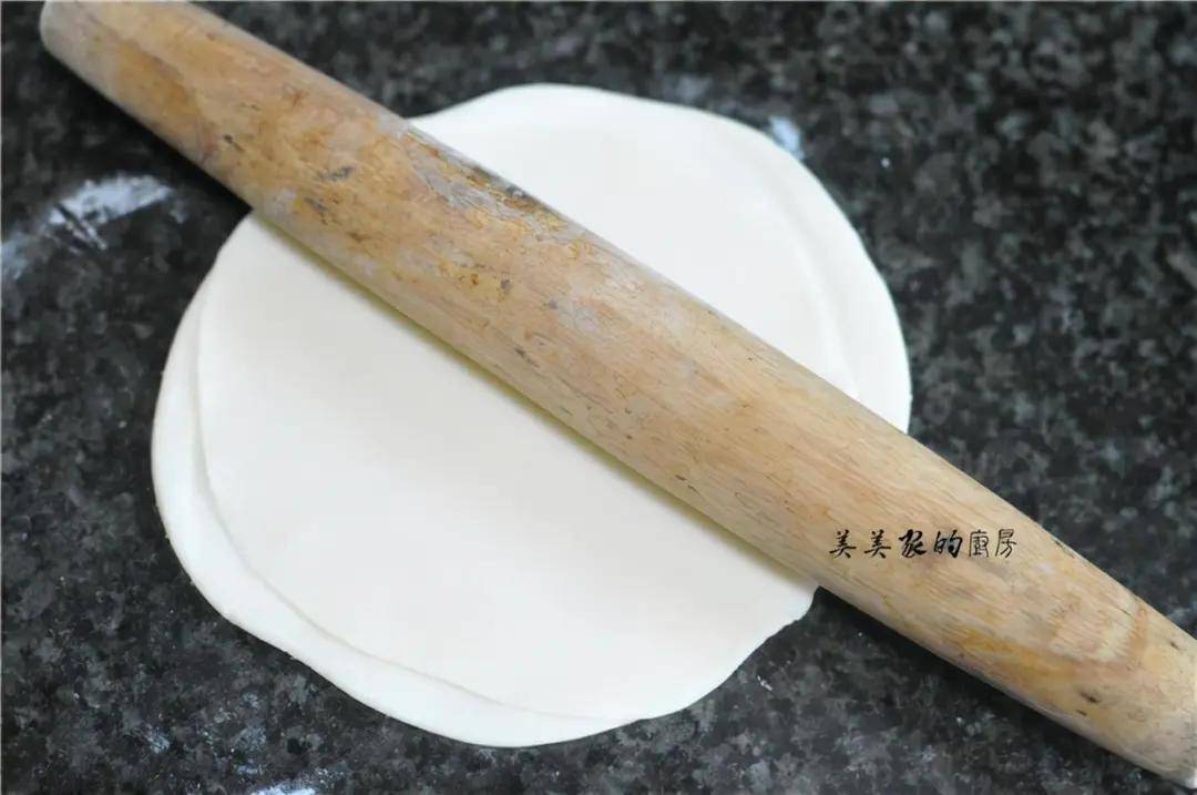 饺子皮五六张摞在一起。用擀面杖稍微擀薄一点。不要擀得太薄了,增大差不多一半即可。太薄了容易露馅。