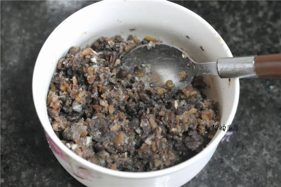 炒好的杂粮盛出来,用擀面杖稍微捣一下,让它变得更粘稠。馅料就准备好了。