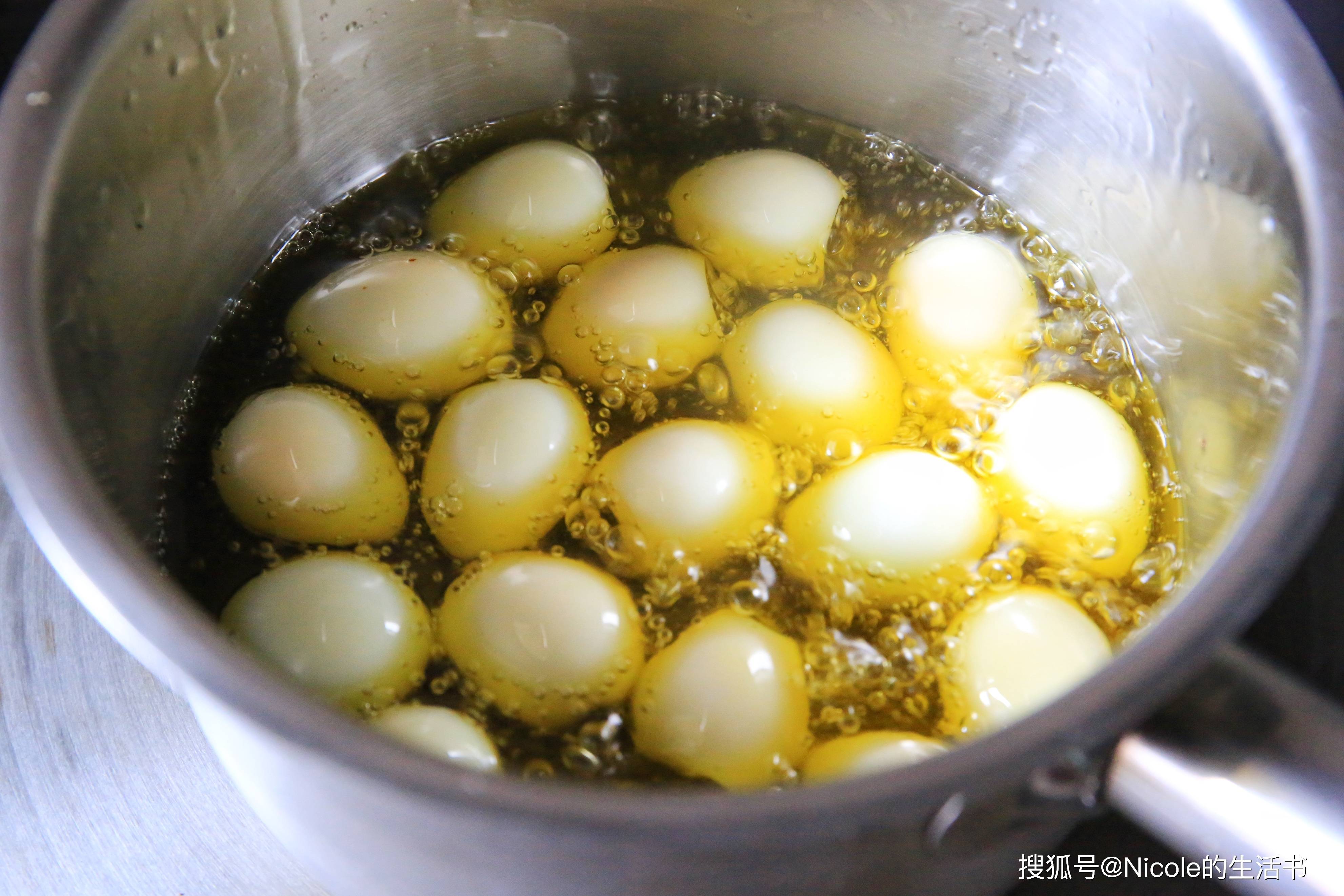 1、锅中加足量油,烧至7成热,放入鹌鹑蛋;