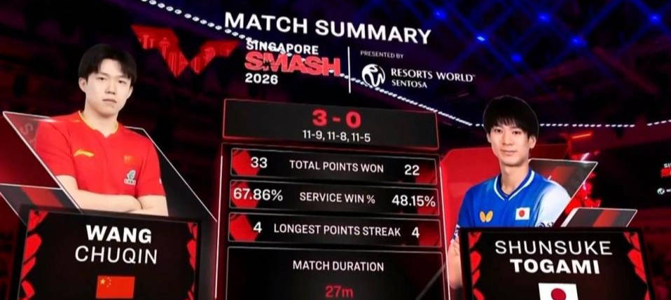北京时间2月25日消息,2026年WTT新加坡大满贯继续进行。男子单打1/16决赛的一场焦点比赛中,世界第一“大头”王楚钦继续有出色表现,在与全日赛男单冠军户上隼辅的较量中,他直落三局以3-0轻松战胜对手,取得两连胜。