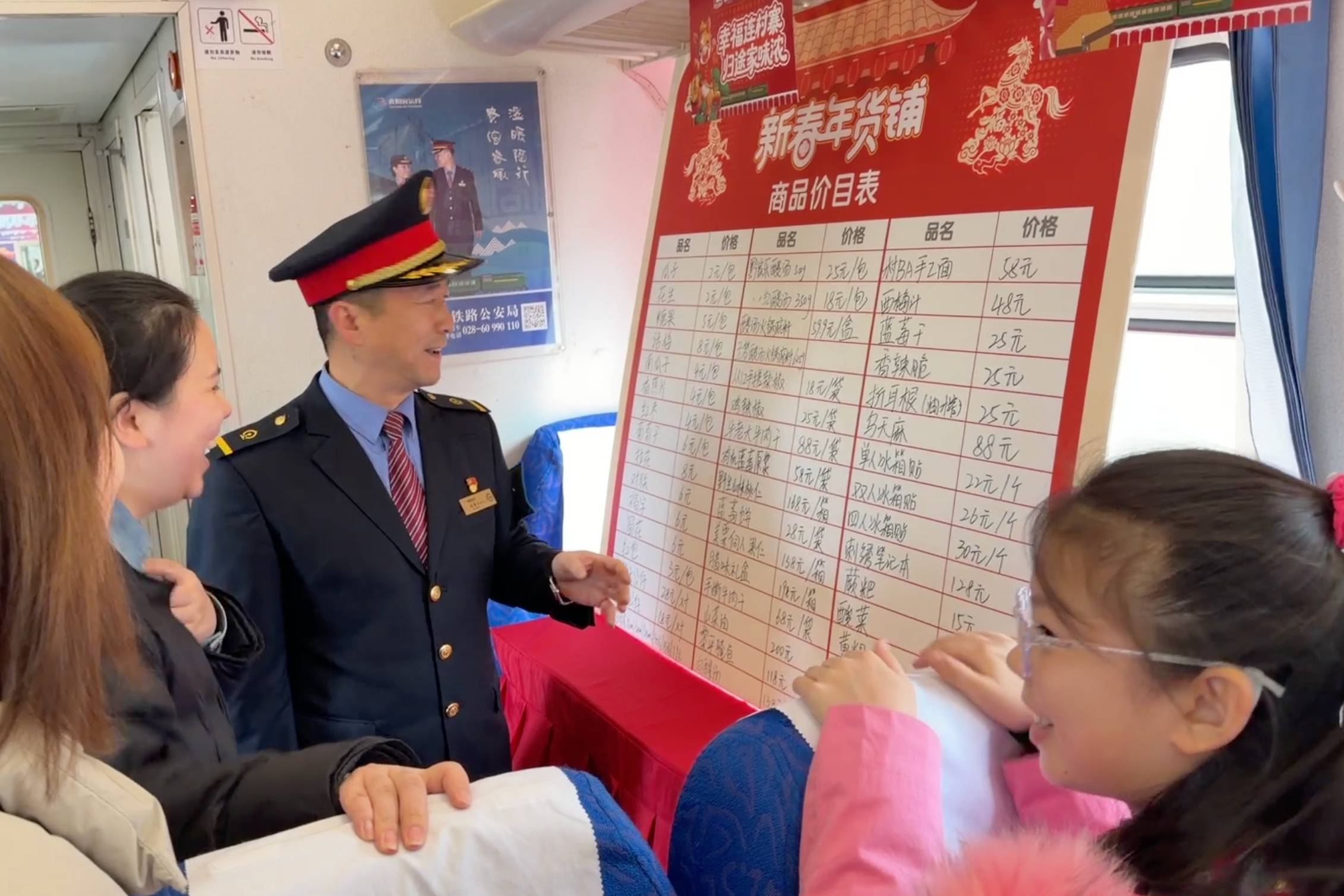5640次列车列车长胡贵川向旅客介绍年货价格。(国铁成都局集团公司贵阳客运段供图)