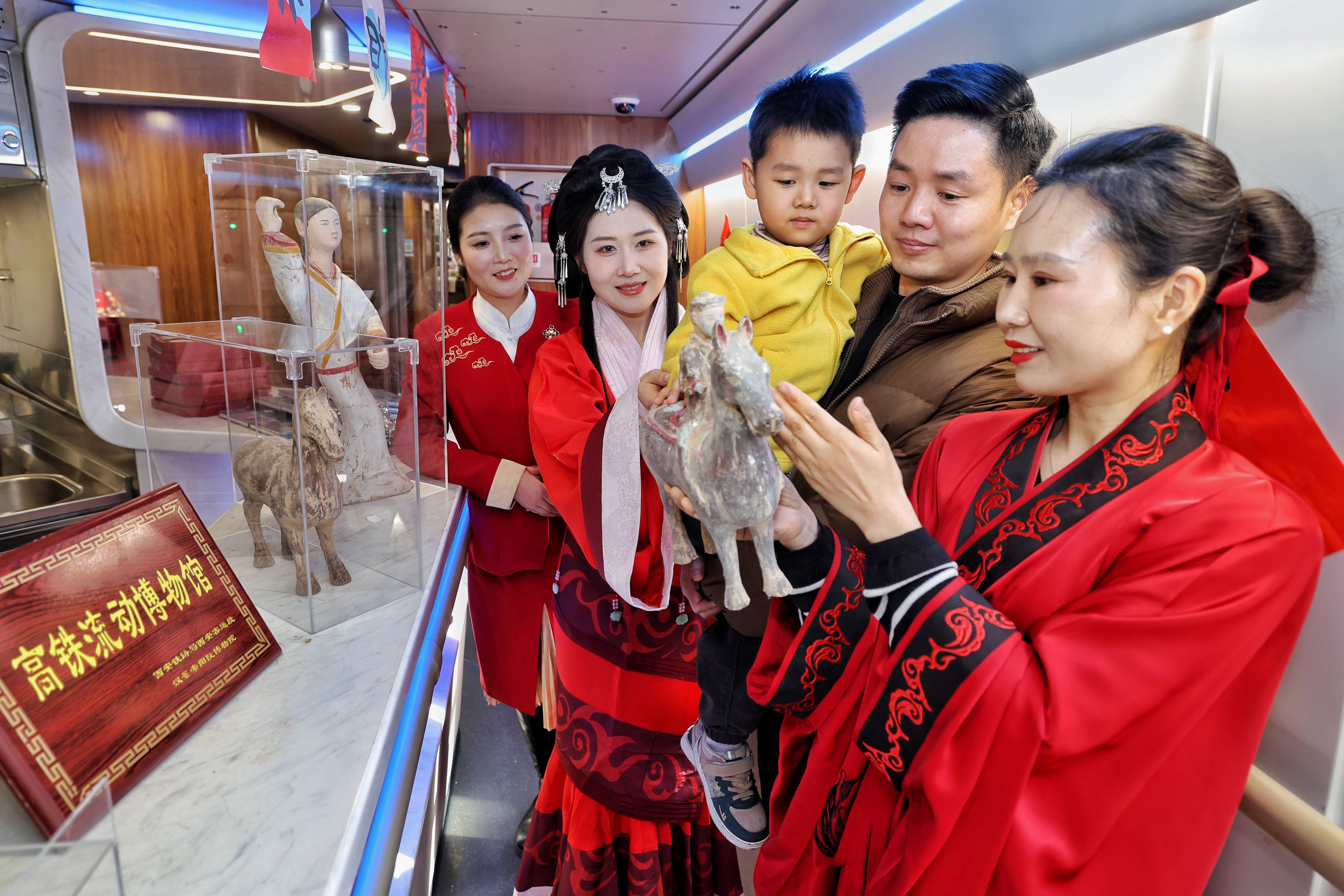 2月11日,南方小年。由西安北发车的G916次列车,车厢内被打造成沉浸式汉代文化体验空间,以汉代马形文物为灵感的主题车窗贴熠熠生辉,马蹄酥等特色美食飘香四溢,马年元素贯穿全程。