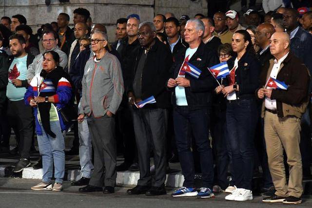 1月27日,在古巴首都哈瓦那,古巴国家主席迪亚斯-卡内尔(前排右三)出席谴责美国霸权主义的游行活动。 新华社发(华金·埃尔南德斯摄)