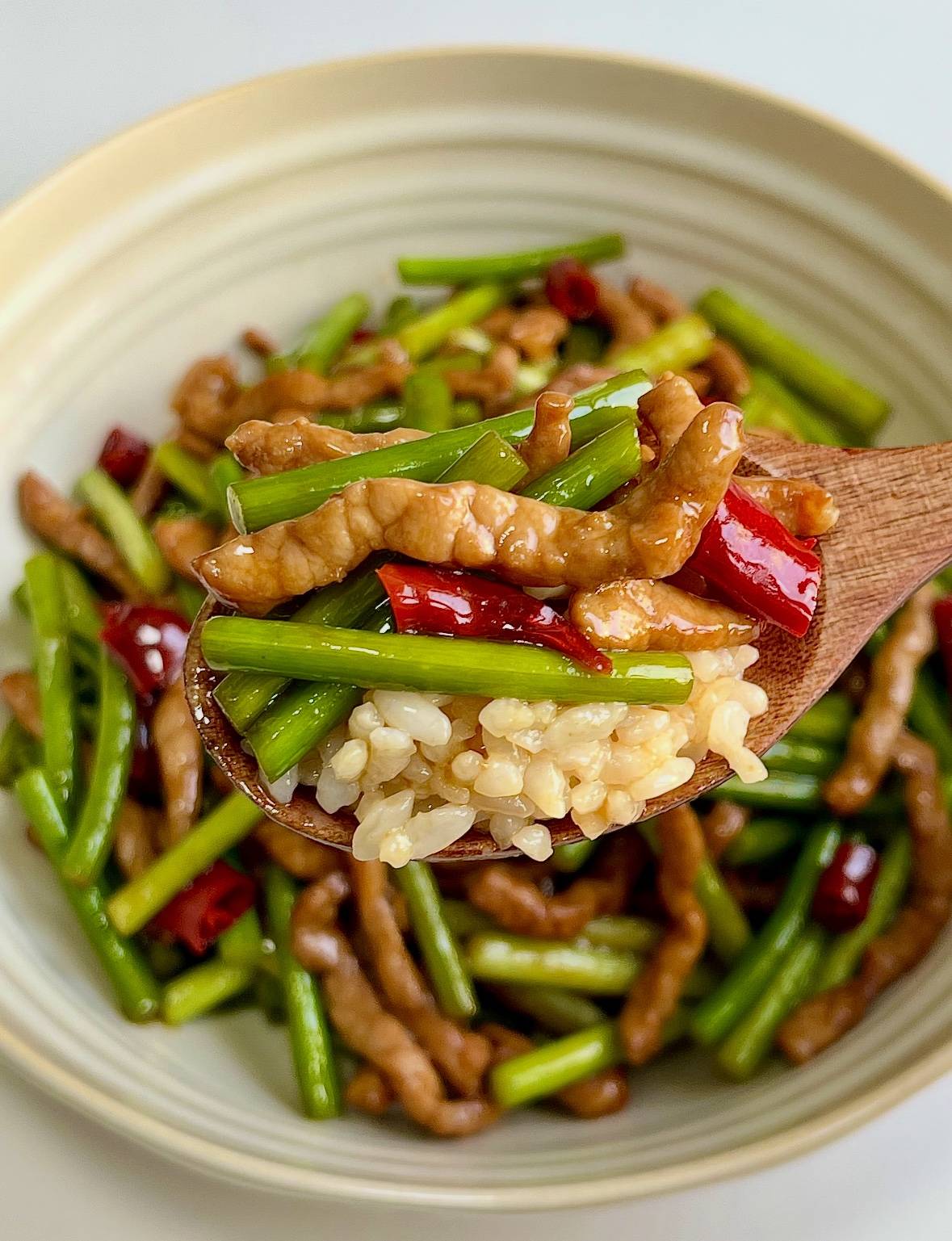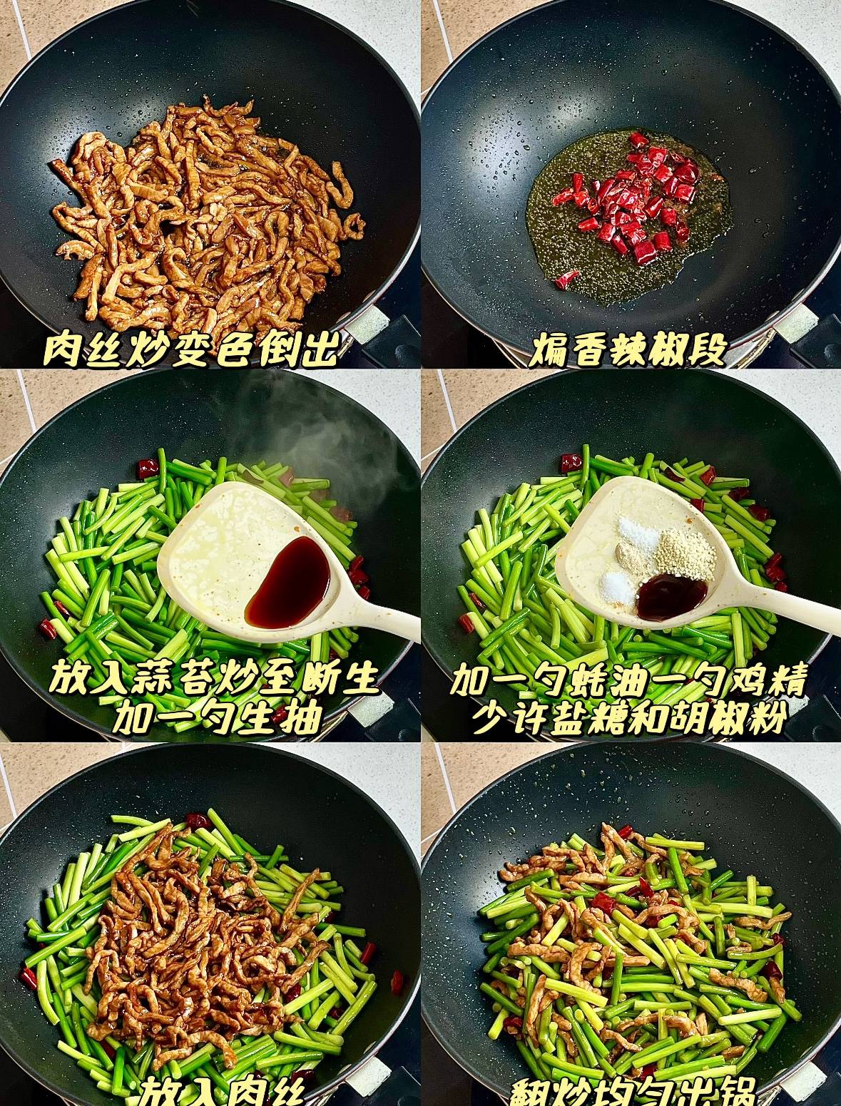先说选材。蒜苔要挑颜色翠绿、梗子挺实的,用手轻轻一掐能掐断,说明嫩。太粗的容易老,太细的又没嚼头,中等粗细的最好。买回来洗干净,切成寸段,长短要一致,炒的时候受热才均匀。肉丝最好用猪里脊或者前腿肉,这两个部位的肉嫩,切丝不容易老。肉先放冰箱冻一会儿,稍微硬一点再切,能切得更细更均匀。切好的肉丝加点生抽、料酒、淀粉抓匀,再淋一点食用油锁住水分,腌上十分钟,炒出来才嫩滑。锅里倒油,油热之后把腌好的肉丝倒进去。肉丝下锅别急着翻,等底面稍微变色再用筷子划散,这样不容易粘锅,也能保持肉丝的完整。看着肉丝从红色变成浅黄,边缘微微卷起,就可以盛出来了。这一步不用炒太久,肉丝刚刚变色就出锅,锅里留点底油,准备炒配菜。蒜苔炒肉丝的点睛之笔在于那几段干辣椒。锅里底油烧热,把干辣椒段放进去,小火慢慢煸。辣椒在热油里慢慢变色,从深红变成暗红,香味一下就窜出来了,带着点焦香,又不至于太辣。这时候把蒜苔倒进去,转大火快炒。蒜苔下锅的那一瞬间,水汽蒸腾,“刺啦”一声响,满厨房都是春天的气息。炒蒜苔火候要足,时间要快。大火爆炒,锅铲不停翻动,让每一段蒜苔都均匀受热。大概炒上一分多钟,蒜苔的颜色变得更加鲜亮,从嫩绿变成油绿,表面微微起皱,这时候就是断生了。断生的蒜苔脆嫩可口,还保留着本身的清甜,炒过头就软塌塌的,失了口感。蒜苔断生了,把之前炒好的肉丝倒回去,和蒜苔一起翻炒均匀。肉丝重新回锅,带着之前腌制的底味,和蒜苔的清香融在一起。这时候开始调味:一勺蚝油提鲜,一勺生抽增香,一勺鸡精让味道更丰富。盐要少放一点,因为生抽和蚝油已经有咸味。再来一点点白糖提鲜,一点点胡椒粉去腥增香。所有调料下锅之后,快速翻炒,让每根蒜苔、每根肉丝都均匀裹上酱色。炒匀之后不用久煮,再翻炒几下就可以出锅了。装盘的时候,蒜苔翠绿油亮,肉丝酱色诱人,红辣椒点缀其间,看着就开胃。夹一筷子送进嘴里,蒜苔脆嫩爽口,带着微微的辣意和清甜;肉丝嫩滑多汁,咸鲜适中。两者一起嚼,蒜苔的脆和肉丝的软形成对比,越嚼越香。再来一口米饭,简直是绝配。