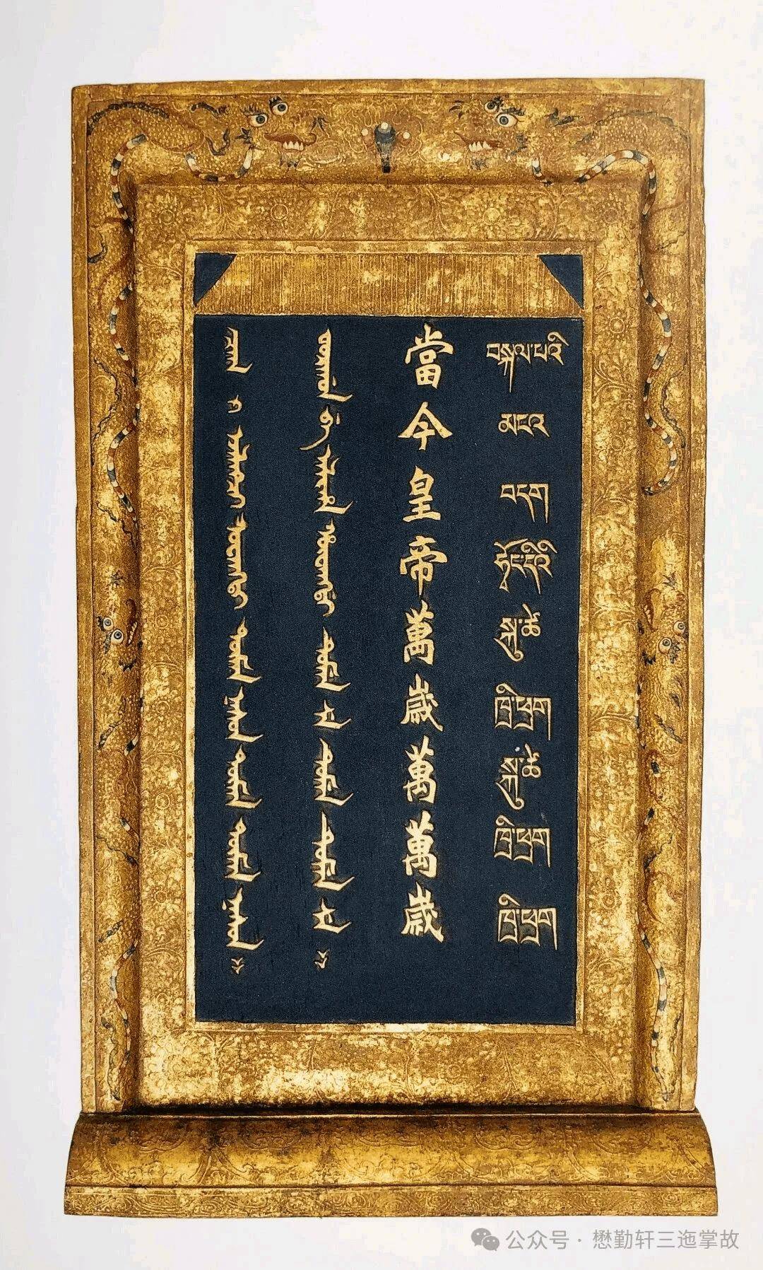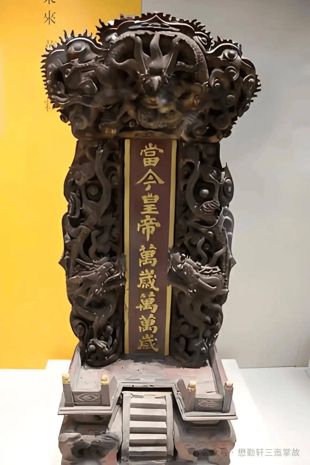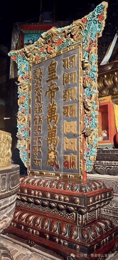 所谓万岁龙牌是指刊有“皇帝万岁”字样的木质或金属牌位,一般供奉在大殿正中神像之前,目前各地仍有不少实物传世,下图中即大昭寺等处供奉的万岁龙牌实物。