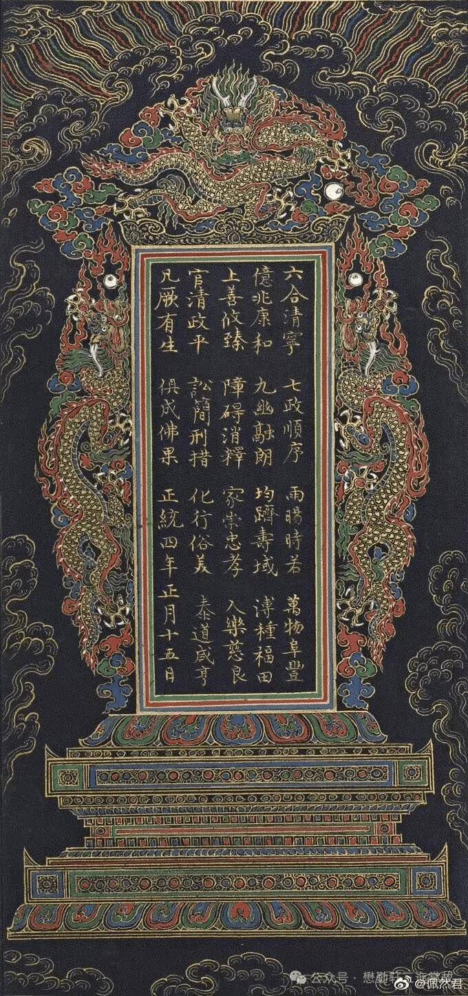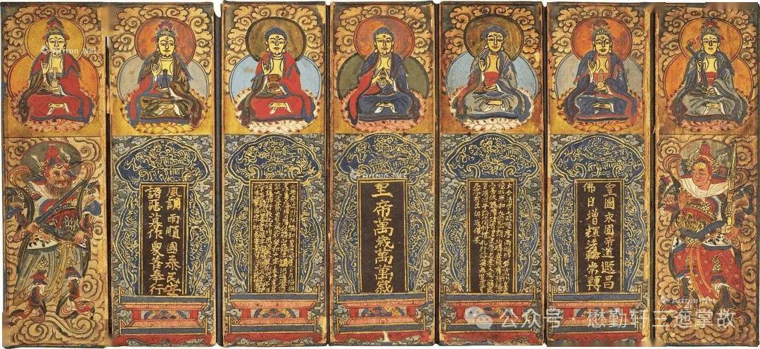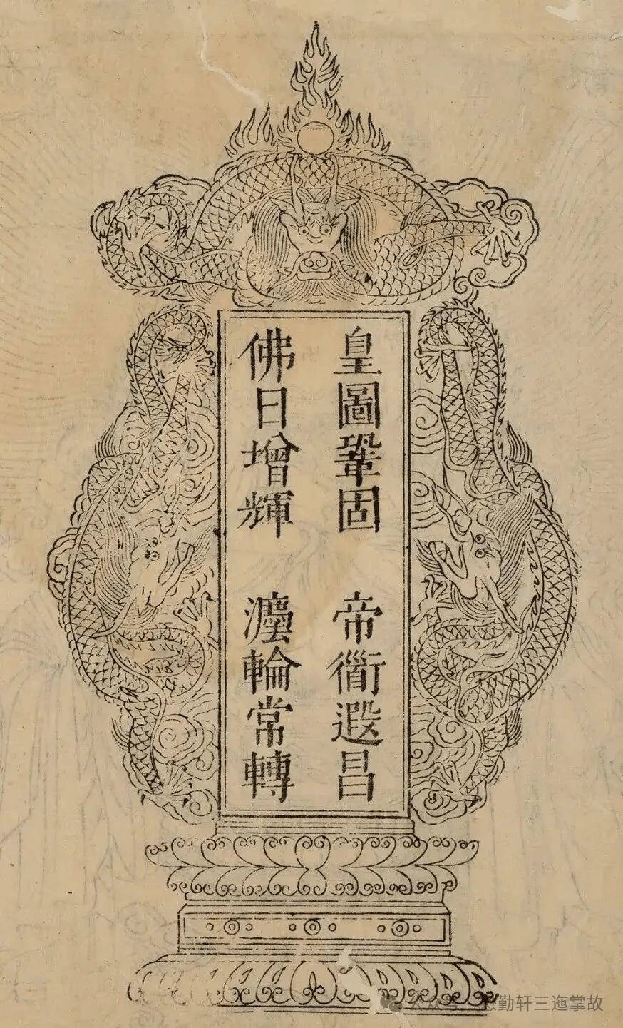 其二是在抄写、刊印佛经时,经文的前面或后面都要印刷或描绘类似龙牌的图案,并皇帝万岁、帝道暇昌等祝国文字,下面即一些相关实例。
