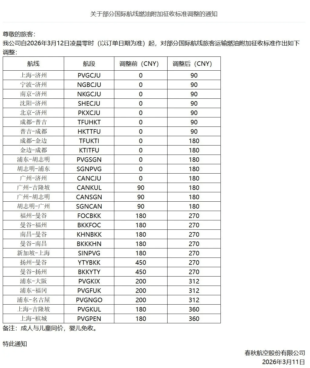 3月12日,春秋航空率先上调近30条国际航线燃油附加费,其中成都直飞普吉、金边两条国际航线的单程燃油附加费,由原来的0元分别上调至90元、180元。同日,国泰航空更新了多条国际航线客运燃油附加费,并表示将根据每月燃油价格动态调整。