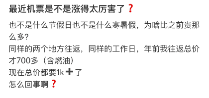 社交媒体平台上,不少游客反映未来两个月飞往东南亚、欧洲、澳大利亚等地的机票价格明显上涨。