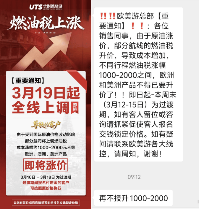 旅行社端的价格同步出现上涨趋势。携程直播间主播透露,受油价潜在上涨影响,今年赴曼谷的机票价格较去年有所提升,4月20日上海至曼谷/芭提雅的往返机票,价格预计上涨300元至1000元。广之旅等旅行社也在3月中旬向客户发出涨价提醒,欧洲、美洲航线因燃油税增加,票价涨幅约1000元至2000元。