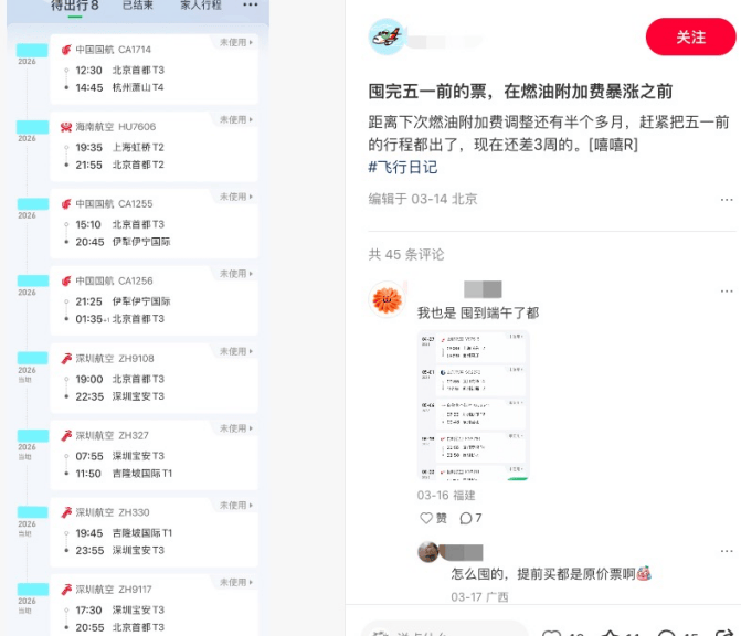面对机票价格走势,有游客开始提前“囤票”。一上海市民表示其一次性囤下国庆、春节两套国际机票,总价约12000元;北京旅客也提前购买了五一假期往返机票,规避后续附加费可能上涨的支出。