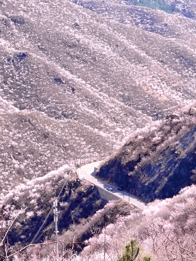 前往景区的路上,皆是治愈系风景。起点从妙峰山镇牌楼出发,沿途蜿蜒山路依山而建,一侧是连绵青山,一侧是幽深山谷,春日里沿途山花烂漫,山桃、山杏次第盛开,粉白相间点缀山间,微风拂过满是花香,全程像是穿梭在天然画廊里,自驾、骑行都格外惬意。