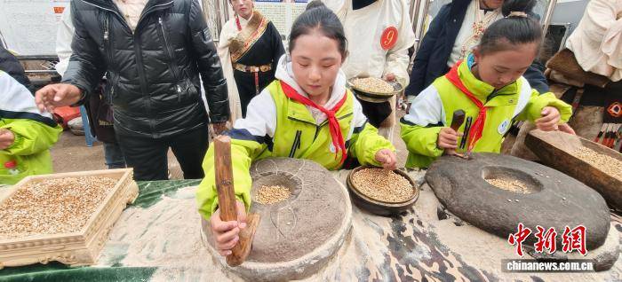 图为俄洛镇赛事活动中组织学生体验传统磨糌粑技能。卡若区融媒体中心 供图