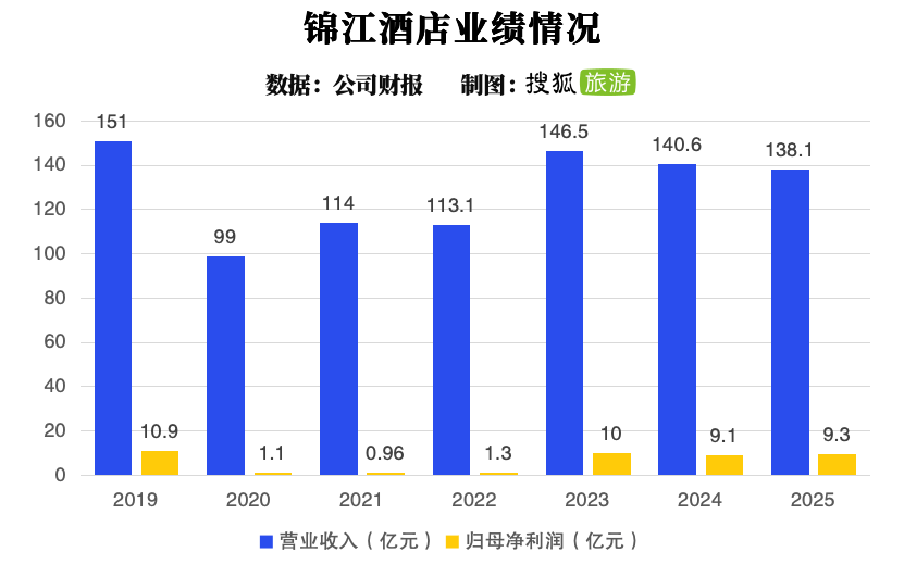 根据锦江酒店发布的2025年年报,公司去年实现营业收入138.1亿元,同比下降1.79%。这已是该公司营收第二年出现下滑。数据显示,2023年公司营收曾短暂回暖,但随后在2024年降至140.6亿元,2025年则进一步跌至138.1亿元,较2019年下滑8.3%。