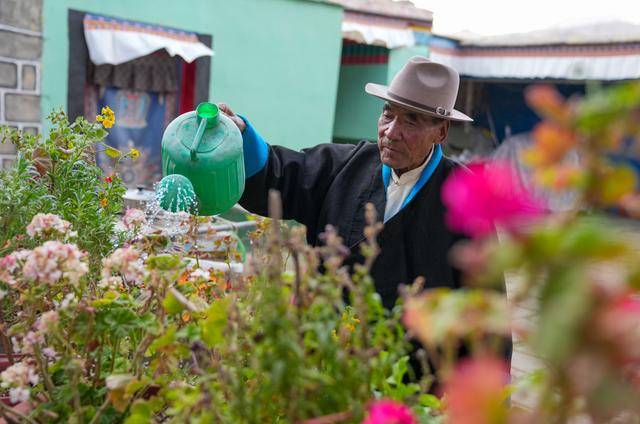 达瓦片多在自家院子给花浇水(晋美多吉 摄)