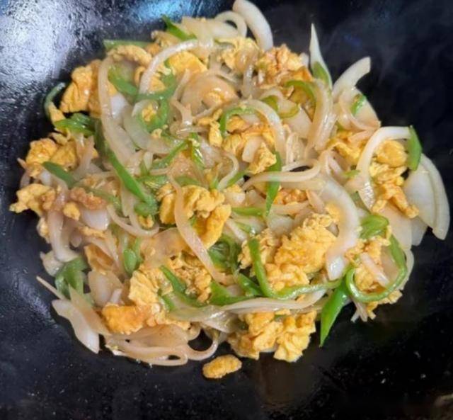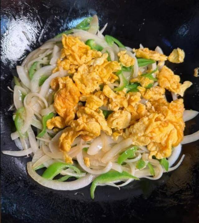 先下洋葱丝,快速翻炒10秒,炒出香味。再下青椒丝,继续翻炒10-15秒。看到蔬菜稍微有点变软,但还保持脆感的时候,把刚才的鸡蛋倒回去。