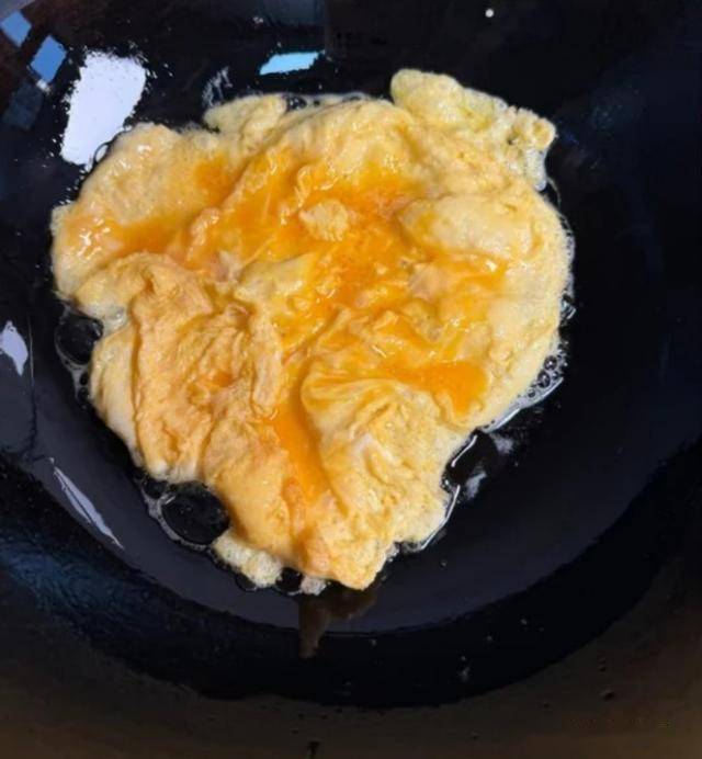 注意! 蛋液一凝固,立马关火,用铲子推一推,盛出来!别炒老了,那种金黄色的、刚熟的鸡蛋才最嫩。这一步大概也就30秒。