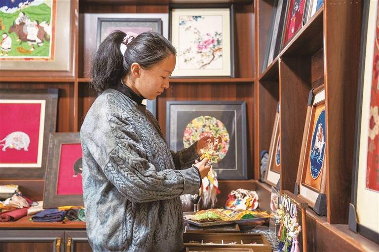 为让古老“堆绣”真正走进日常生活,团队还常态化走进社区、企业、校园开展非遗体验活动,坚持创作群众能用、喜欢、接地气的实用文创,让非遗可感、可触、可亲。