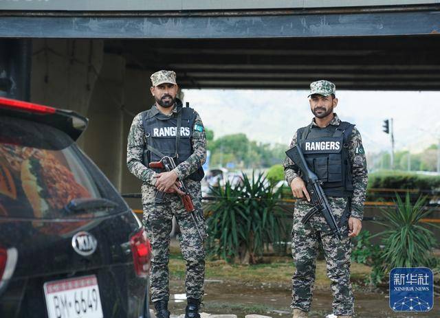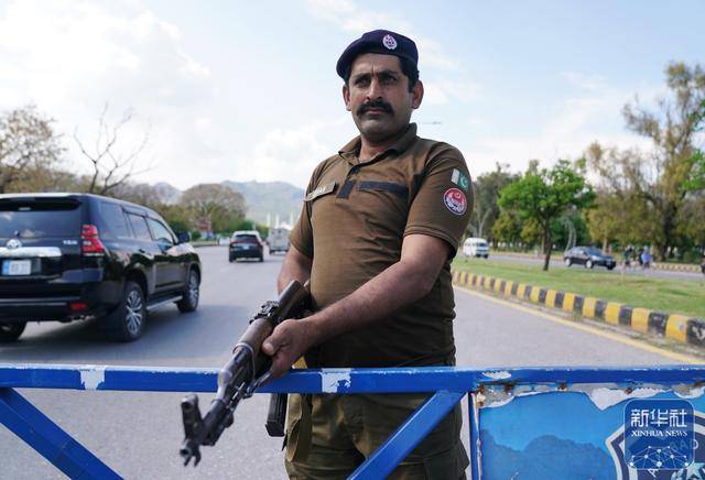 4月9日,在巴基斯坦首都伊斯兰堡,军警荷枪实弹在主要路口执勤。