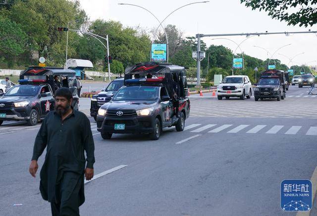 4月9日,在巴基斯坦首都伊斯兰堡,军警车队经过巴基斯坦国家主要政务部门所在地的安全核心区。