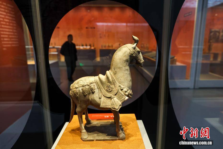 4月10日,湖北武汉,在武汉博物馆举行的“霸府名都——太原市博物馆馆藏北朝隋唐精品文物展”吸引观众参观游览。展览精选该馆珍藏的北朝至隋唐时期文物精品130余件(套),涵盖陶俑、金币、瓷器、碑刻拓片等品类,生动勾勒晋阳从军事要塞到霸府名都的发展脉络,全方位展现古晋阳民族交融、文化多元、开放包容的盛世气象。图为观众参观展出的唐代陶马。中新社记者 张畅 摄