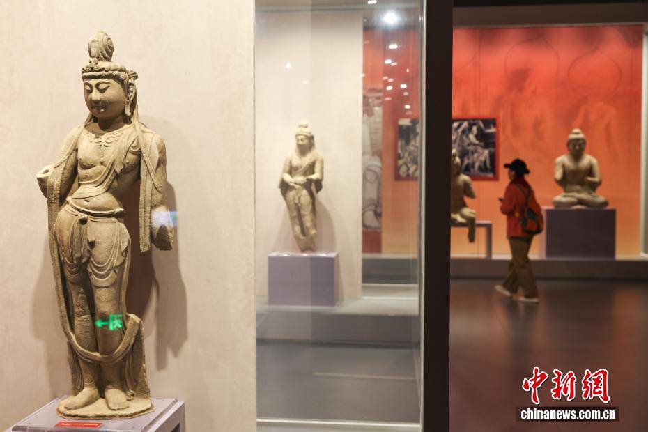 4月10日,湖北武汉,在武汉博物馆举行的“霸府名都——太原市博物馆馆藏北朝隋唐精品文物展”吸引观众参观游览。展览精选该馆珍藏的北朝至隋唐时期文物精品130余件(套),涵盖陶俑、金币、瓷器、碑刻拓片等品类,生动勾勒晋阳从军事要塞到霸府名都的发展脉络,全方位展现古晋阳民族交融、文化多元、开放包容的盛世气象。图为展览展出的唐代天龙山第21窟东壁南侧菩萨像复制件。中新社记者 张畅 摄