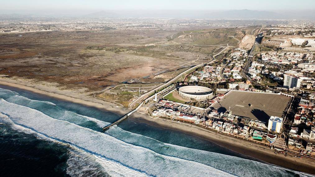 这是2019年1月10日在墨西哥边境城市蒂华纳航拍的美墨边境墙。新华社记者辛悦卫摄