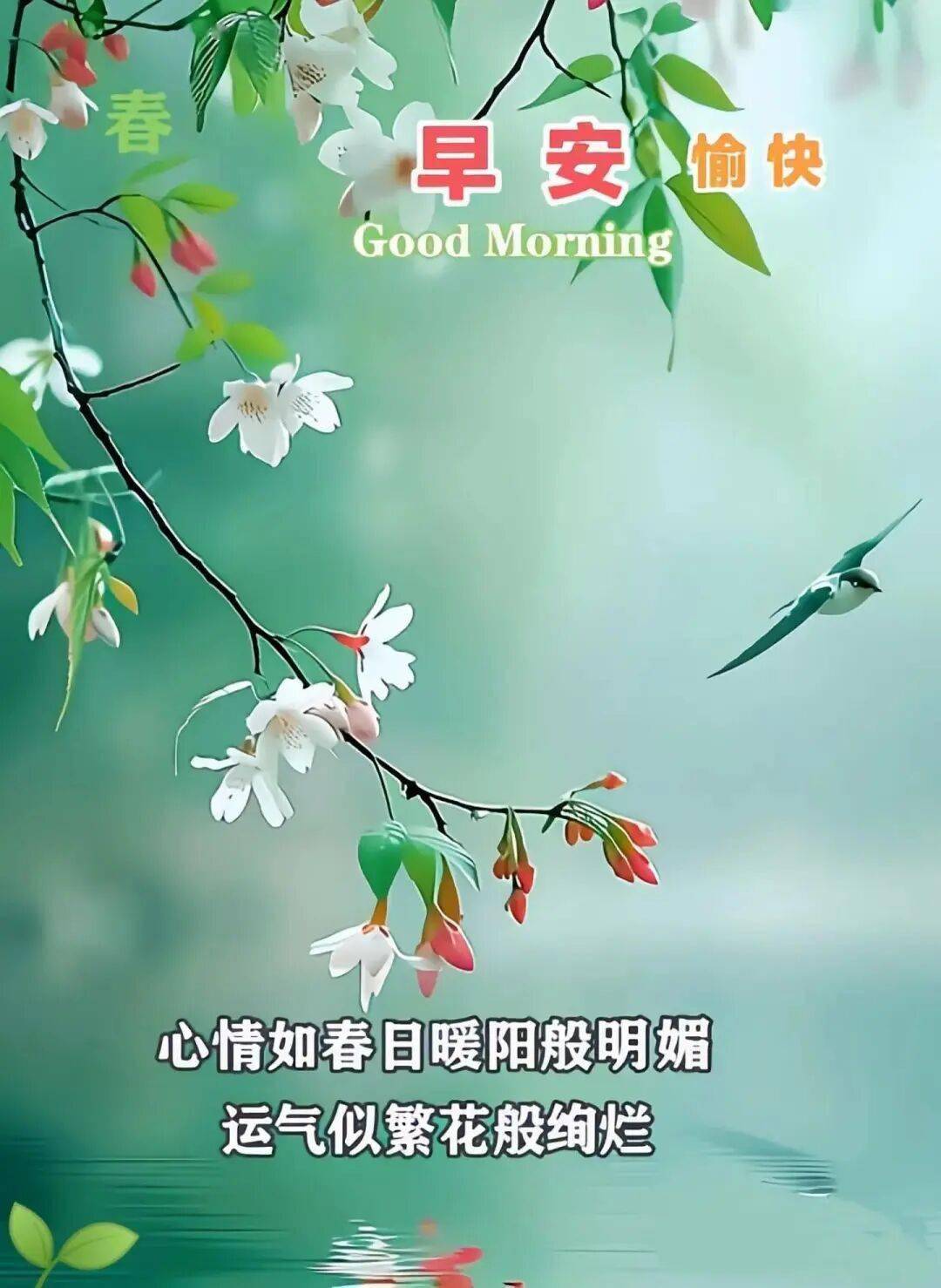 早安。种子破土沐春阳,春溪迂回入大江。愿眼里有春芳灿烂,掌心攒春光璀璨,愁绪飘作天边云,笑语串成生活锦。前程锦绣无阻拦,时光温柔常相伴。春花开,燕呢喃,心欢颜,事遂愿。