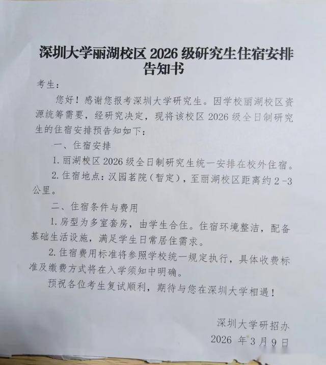 研究生住 “万元月租小区” 引发全网热议!深圳大学丽湖校区 2026 级研究生将统一安排校外汉园茗院小区住宿,月租高达 1 万元,引发质疑:学生住豪宅?学校奢侈浪费?深大正式回应:所有住宿费用由学校承担,学生无需支付任何费用,仅为解决校内宿舍不足问题,并非 “特权待遇”。