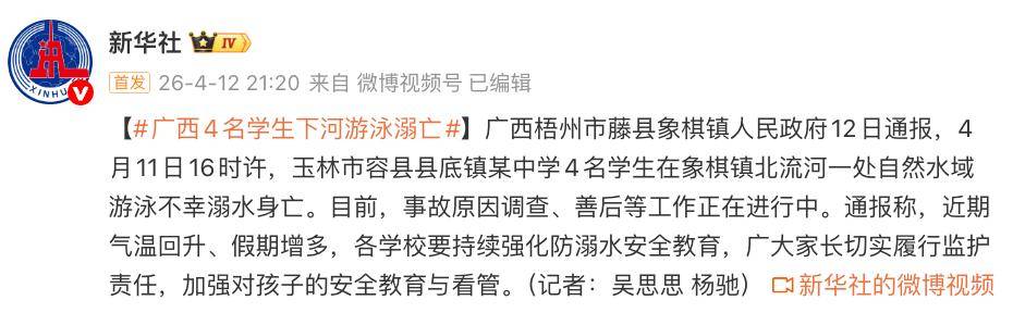 据新华社,“藤县融媒”通报:2026年4月11日(周六)下午约16时许,玉林市容县县底镇某中学4名学生在梧州市藤县象棋镇北流河一处自然水域游泳不幸溺水身亡。目前原因调查、善后等工作正在进行。