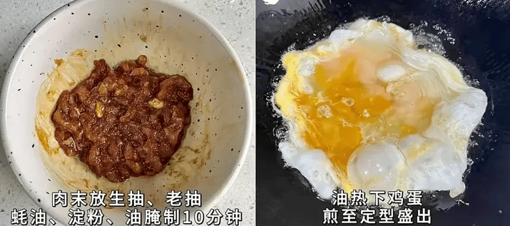 肉末加 1 勺生抽、半勺蚝油、少许淀粉、几滴老抽、一点食用油,抓匀腌 10 分钟。