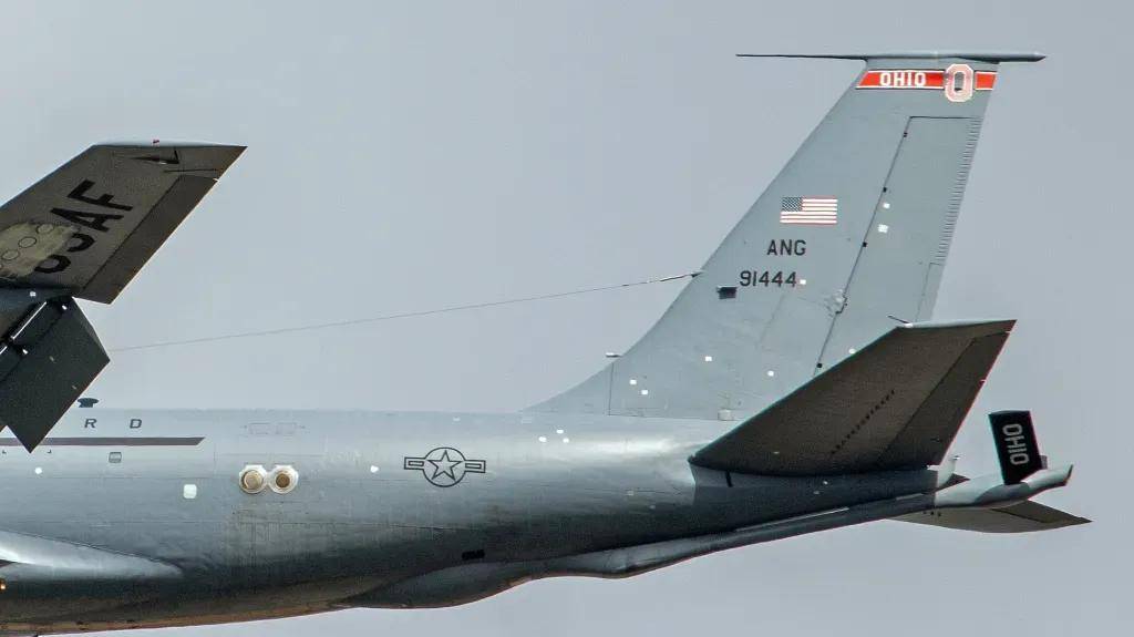 昨天,一架从中东转场返回美国本土、路过英国米尔登霍尔空军基地的美国俄亥俄州空中国民警卫队(OHIO ANG)的KC-135R型空中加油机,引起了外界的关注,根据拍摄该机的英国航空摄影师麦克维的照片显示,这架KC-135R型空中加油机被打了个“满脸花”,满身都是被临时打的“补丁”。